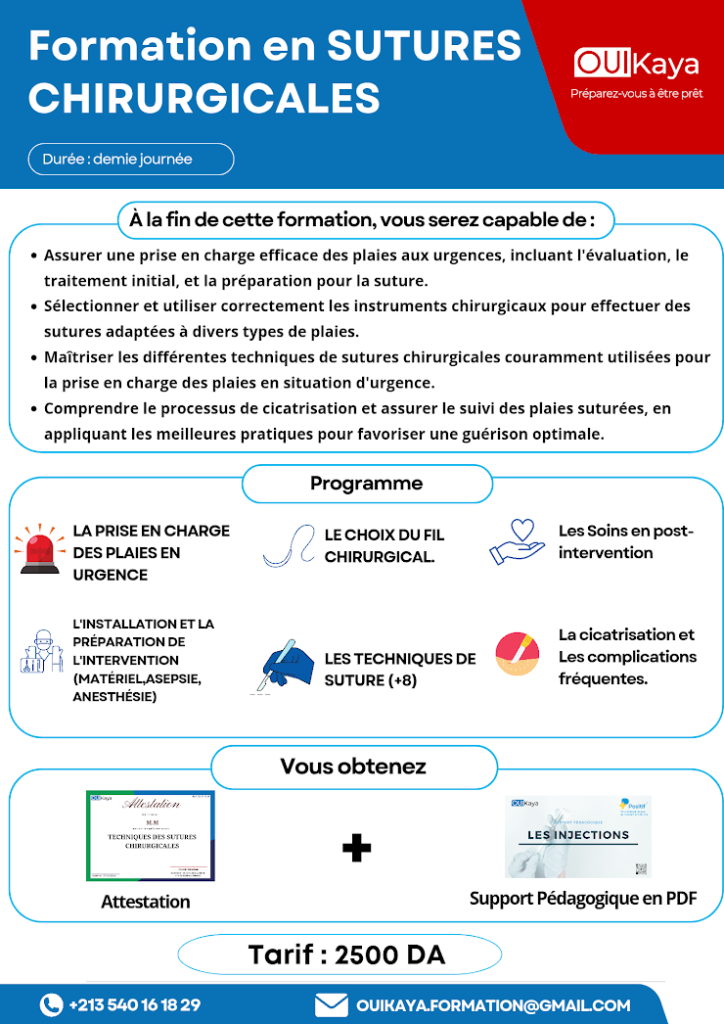 Cette formation pratique vous offre une opportunité unique d’apprendre et de maîtriser plus de 8 techniques de sutures chirurgicales, incluant les points simples, en U, en X, ainsi que les sutures intradermiques.